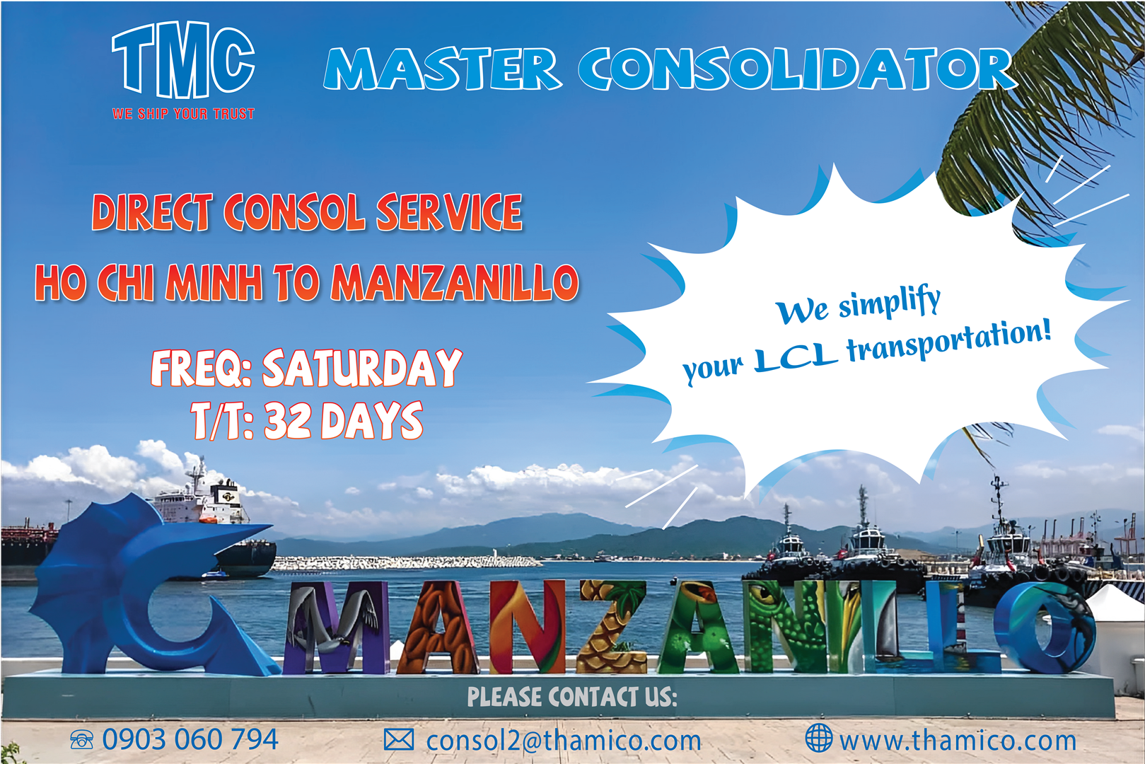 Tuyến vận chuyển hàng lẻ HCM – Manzanillo của Thamico giúp kết nối nhiều doanh nghiệp Việt Nam với thị trường Mexico rộng lớn. Với 26 năm kinh nghiệm, đội ngũ nhân viên chuyên nghiệp và hệ thống đại lý rộng khắp toàn cầu, Thamico cam kết mang lại trải nghiệm dịch vụ vận chuyển hàng hóa an toàn, hiệu quả và tin cậy cho Quý khách hàng. Sự uy tín và chất lượng dịch vụ vượt trội của Thamico là điều giúp Quý khách hàng an tâm lựa chọn khi có nhu cầu vận chuyển hàng hóa trong và ngoài nước.