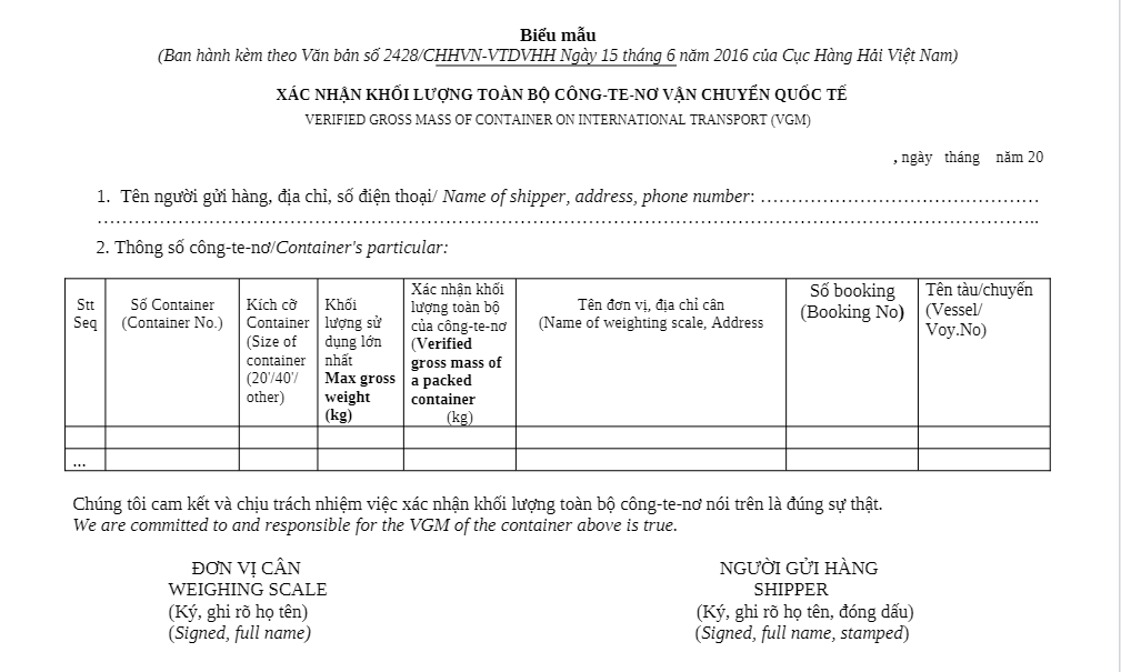 Bạn có thể tải về biểu mẫu phiếu cân VGM tại đây